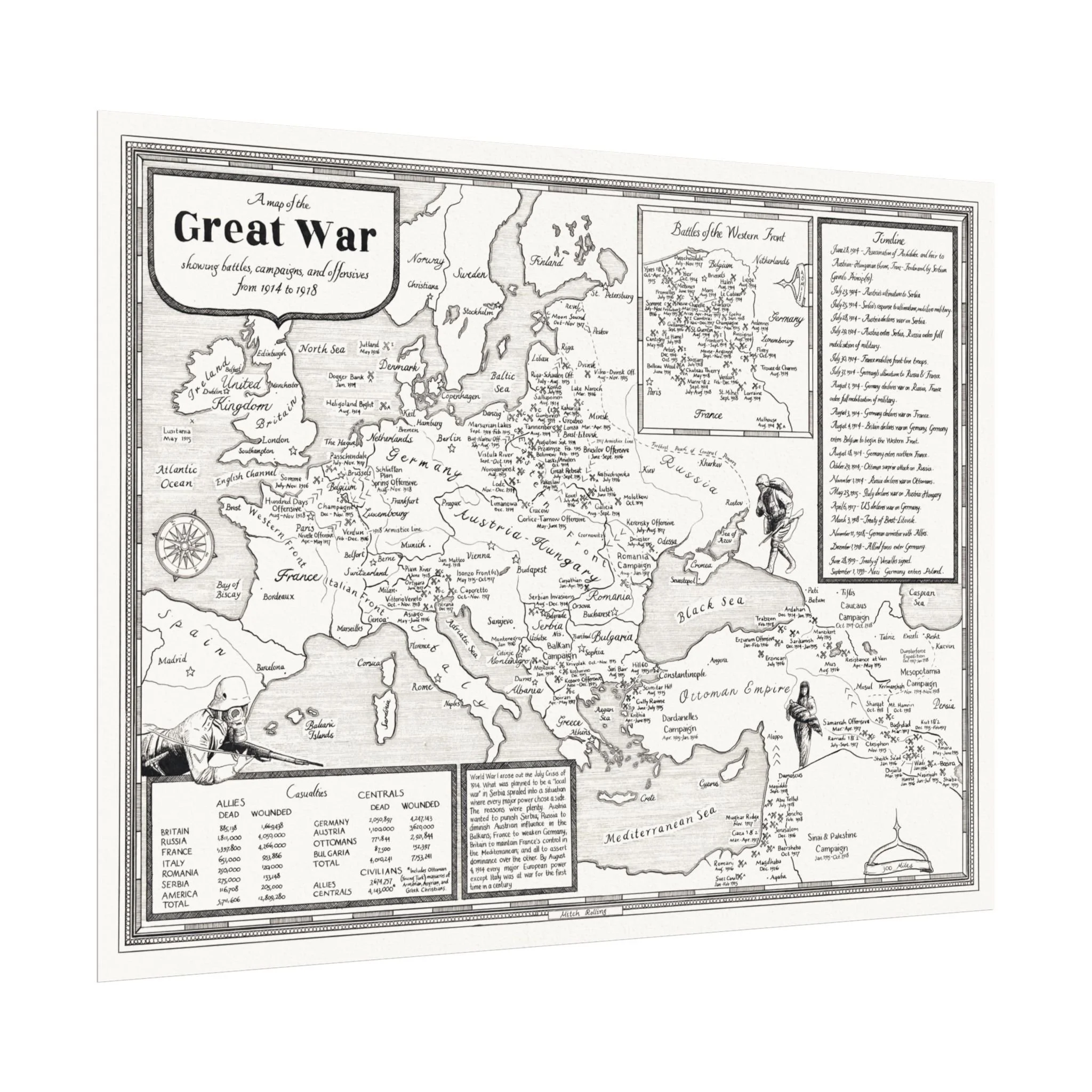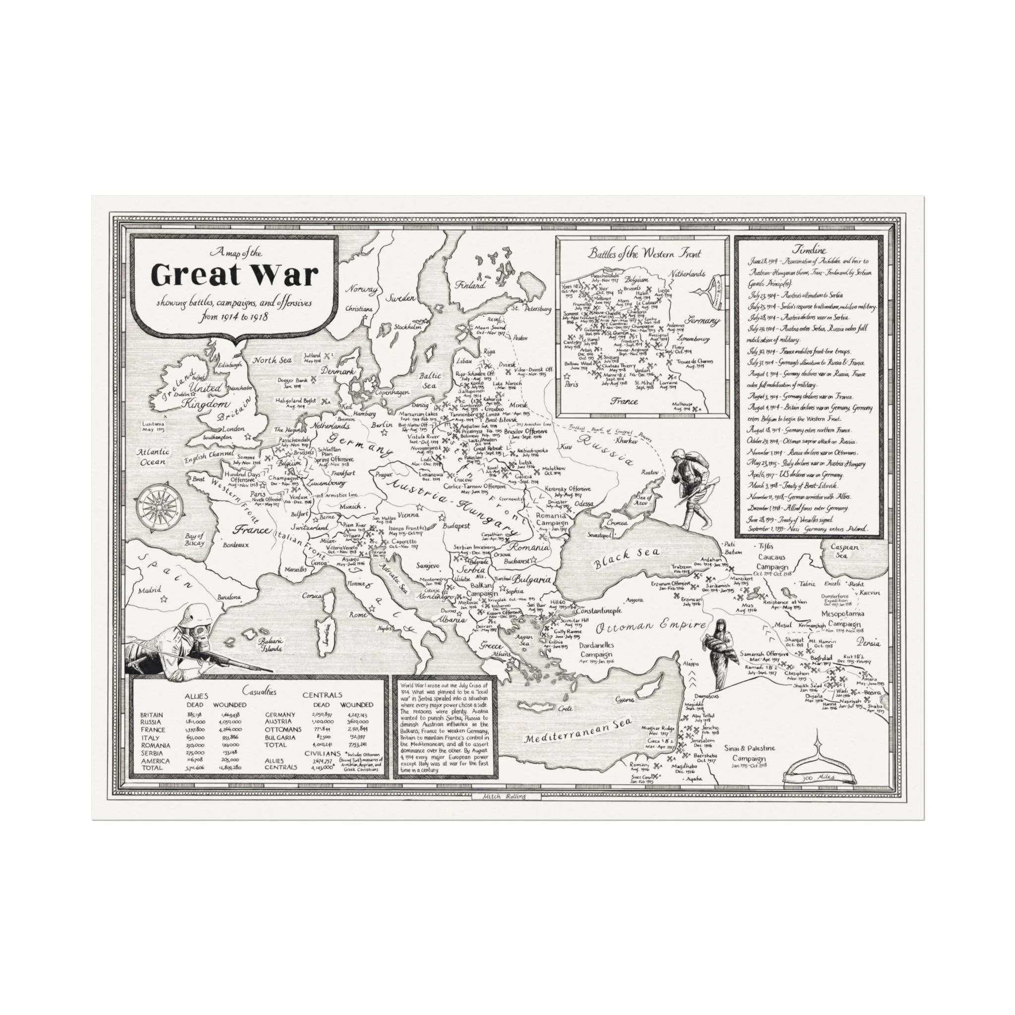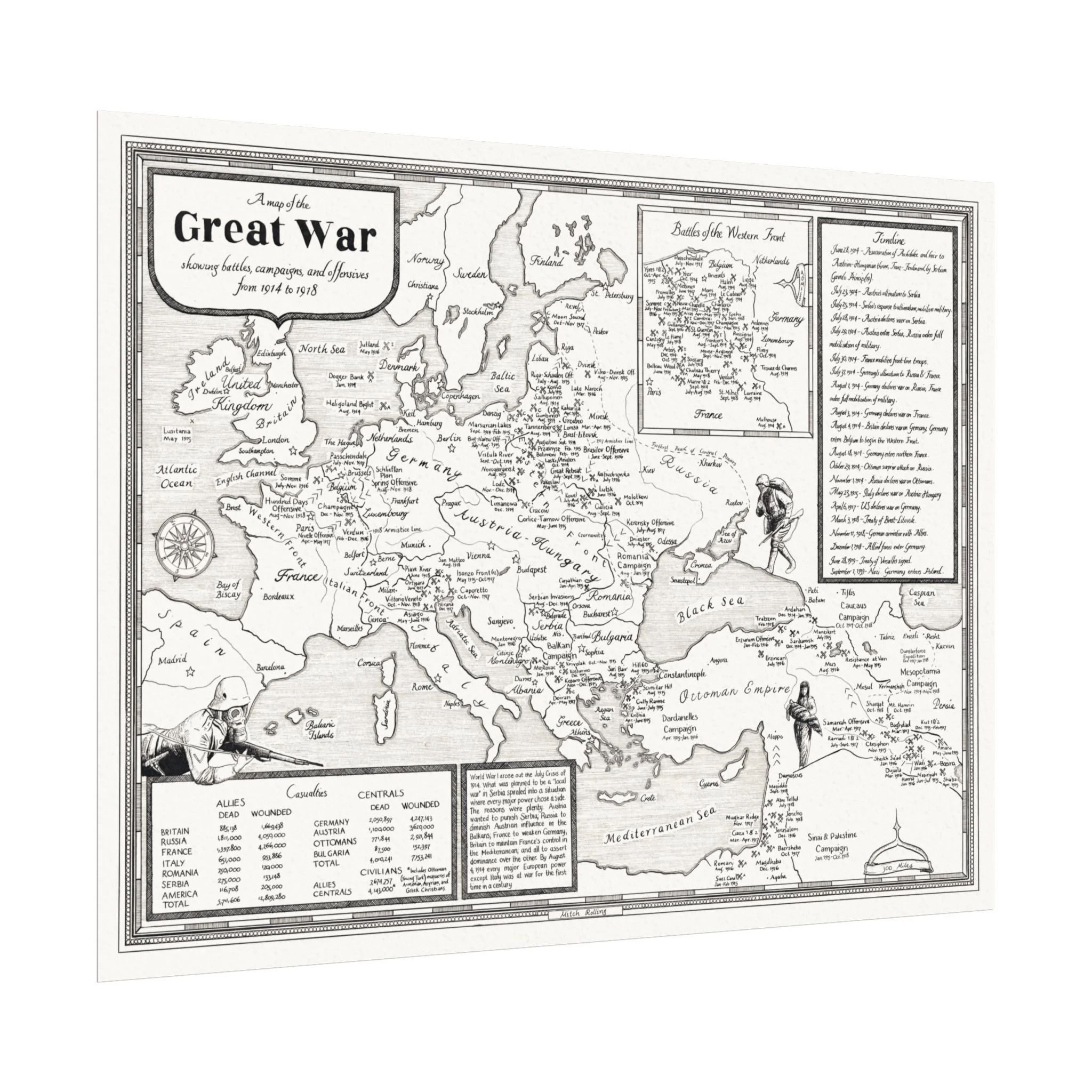 This WWII map shows all the major theaters of war, major battles and events throughout, territorial changes of Germany and Japan, total casualties for all major countries involved, and several detailed hand-drawn images of events during the war.
