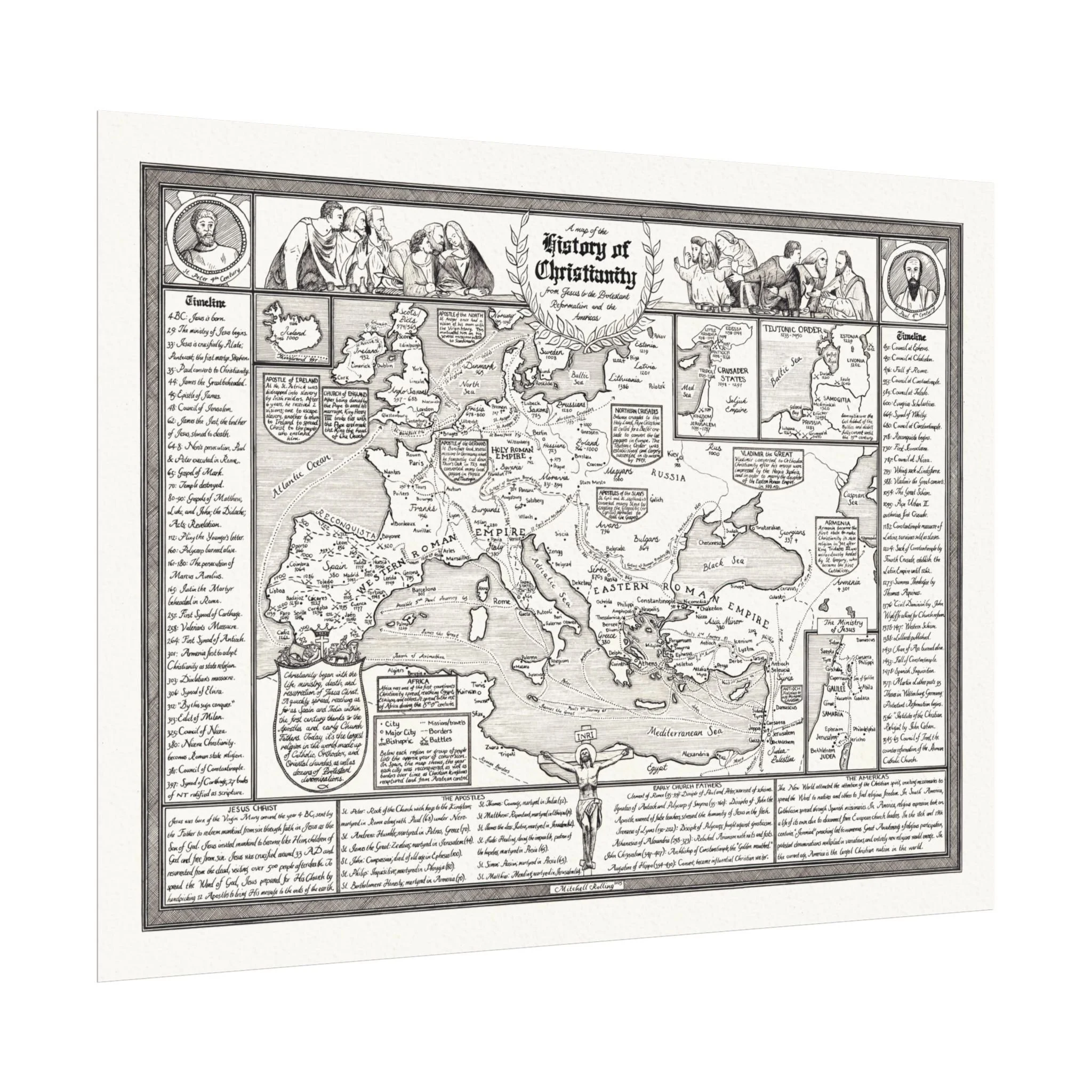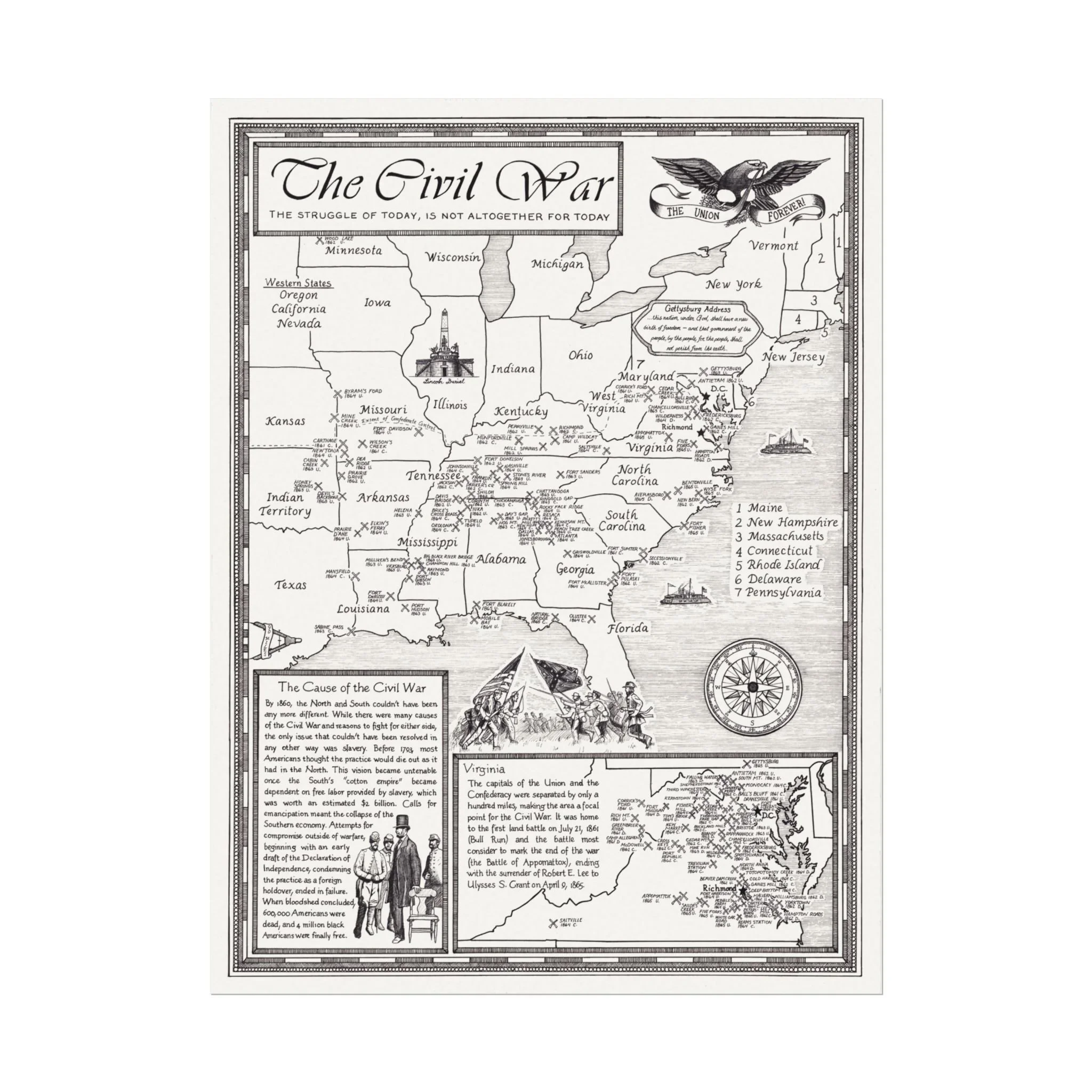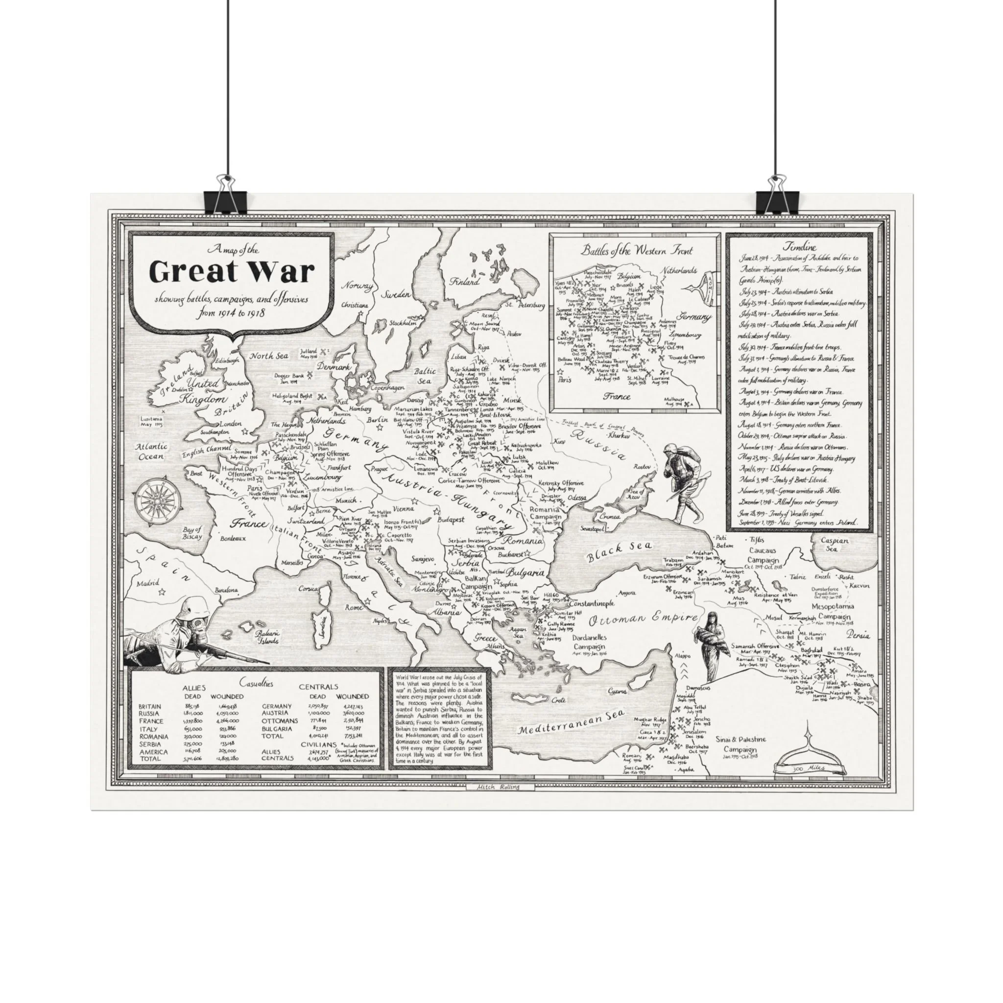 This WWII map shows all the major theaters of war, major battles and events throughout, territorial changes of Germany and Japan, total casualties for all major countries involved, and several detailed hand-drawn images of events during the war.