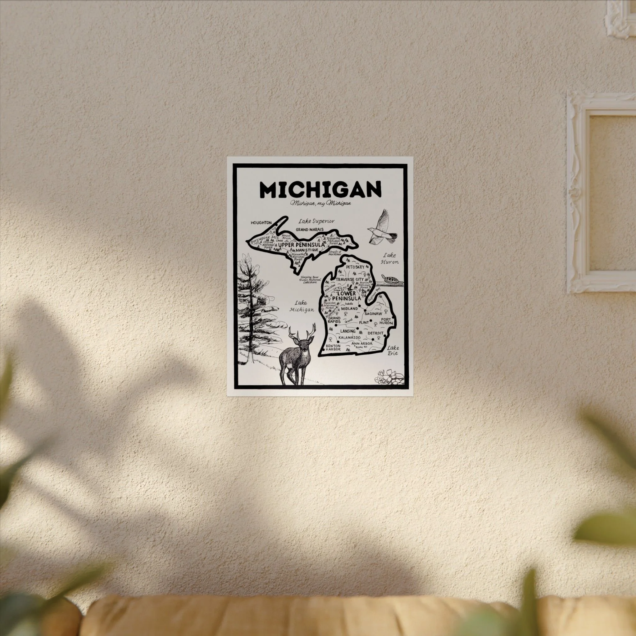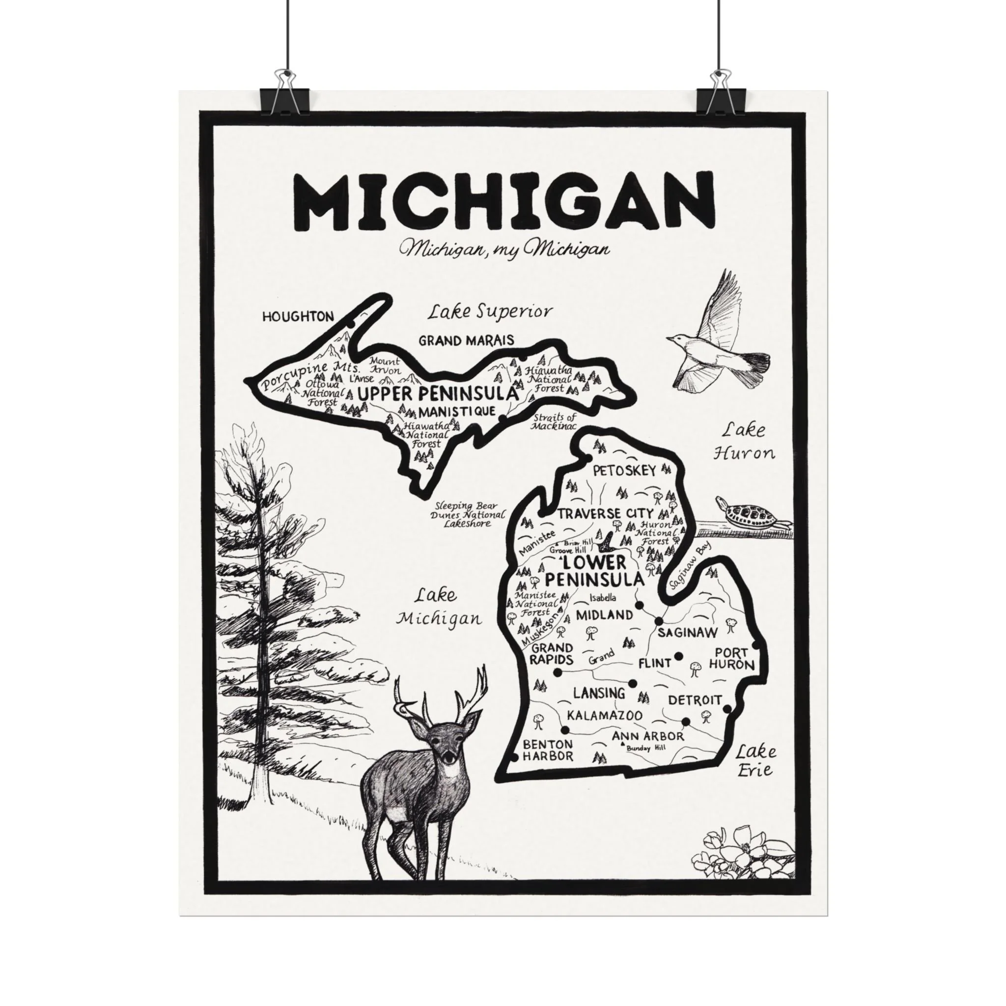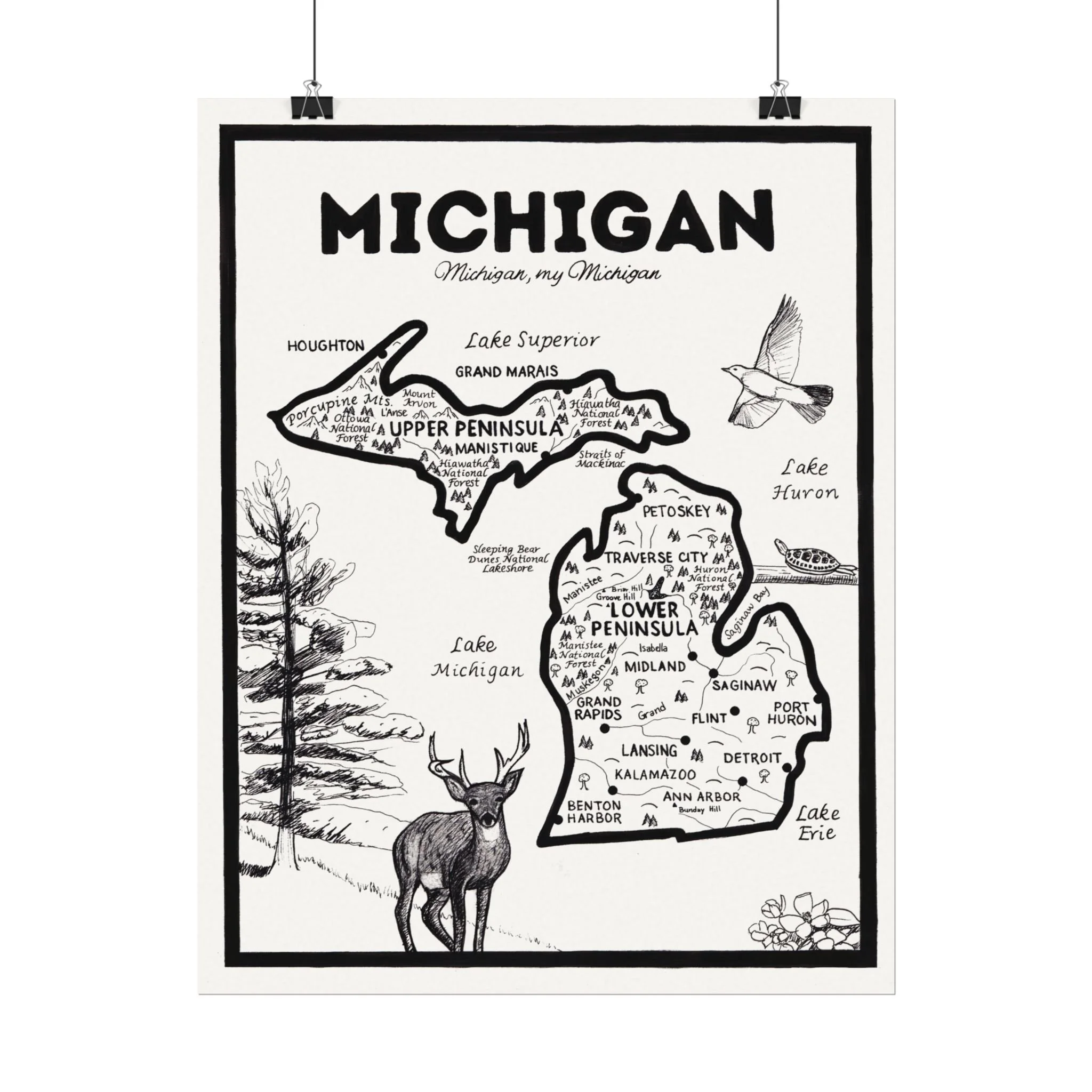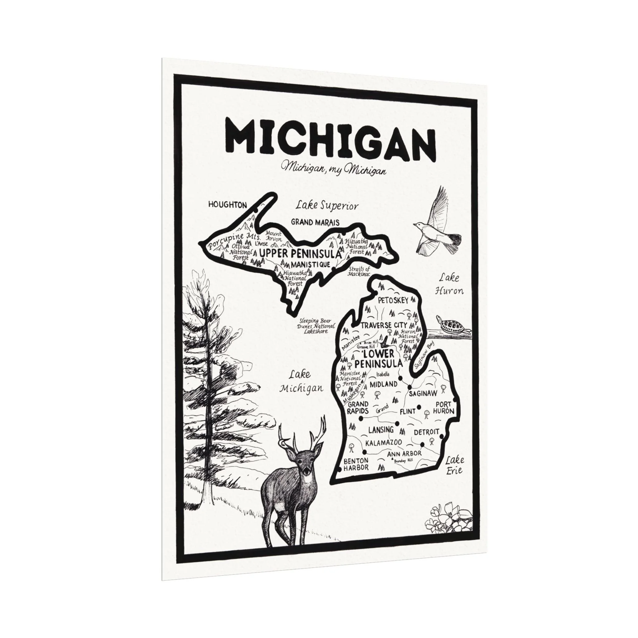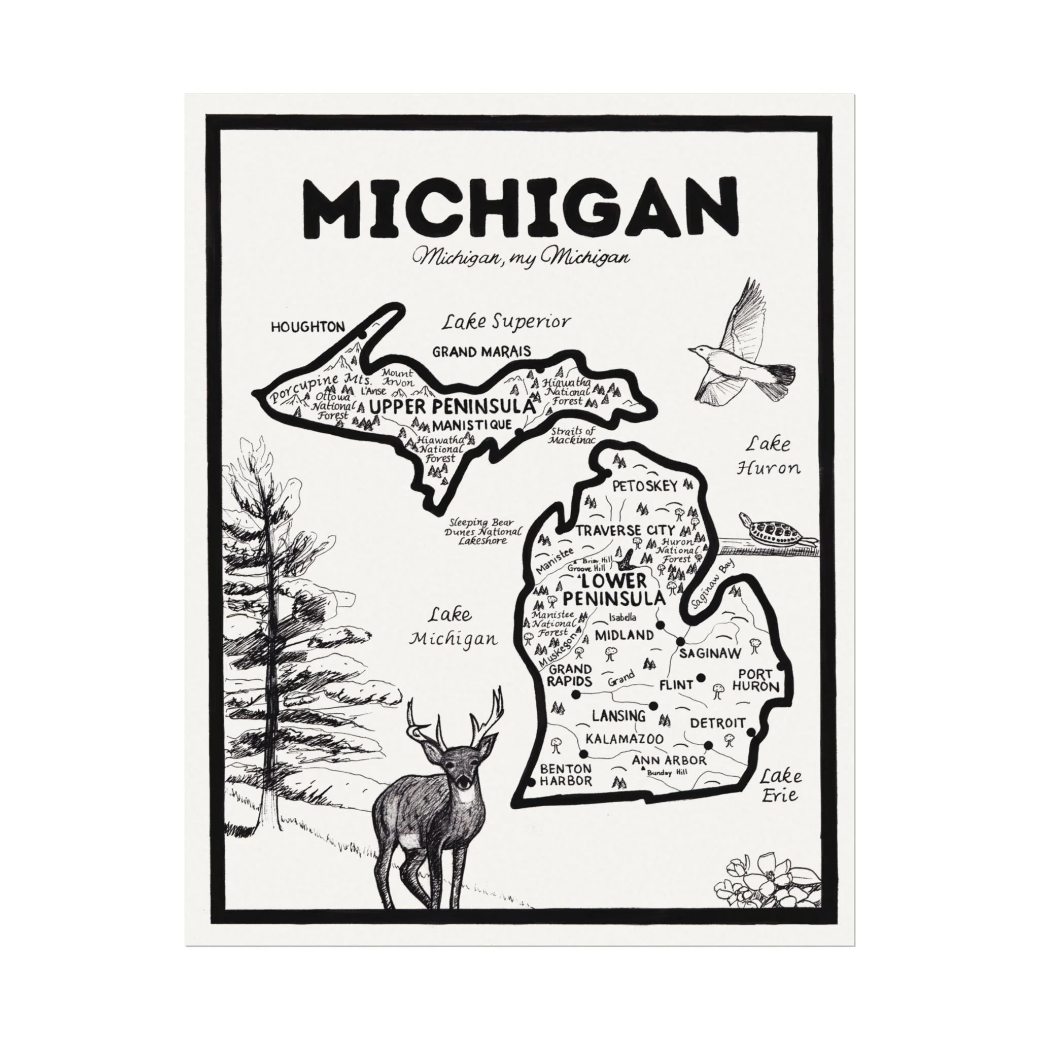 Art print of a hand-drawn map of Michigan. Featured Michigan Symbols & Locations: